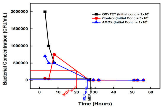 The microbial count of the amoxicillin-exposed isolates decreased from 1 × 108 CFU/mL to 1 × 104 CFU/mL on the second day, when exposed to a very high ampicillin concentration, giving an MDK99.99 of 26 h (Figure 2). The OXYTET-exposed isolates had an MDK99.99 value of 28 h, with the initial concentration of 2 × 108 CFU/mL decreasing to 2 × 104 CFU/mL on the second day (Figure 2).