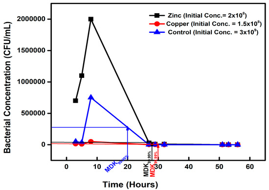 The minimum time required to kill 99.99% (MDK99.99) of the zinc- and copper-exposed isolates compared to the control.