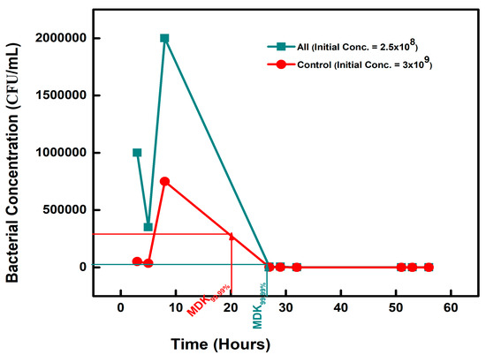 The combined chemical (ALL)-exposed isolates subjected to a high ampicillin concentration recorded an MDK99.99 value of 26 h with a concentration of 2.5 × 104 CFU/mL on the second day, from an initial 2.5 × 108 CFU/mL (Figure 4).