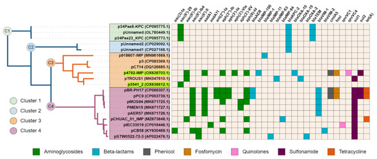 Phylogenetic tree and resistance heatmap. Plasmids from the current study are highlighted in green. The different tree clusters (C1 ÷ C4) are distinguished by varying colors. The heatmap legend below provides information on the antibiotic class of the detected genes. The tree was generated with neighbor-joining after the NCBI blast with Max Seq Difference score ≥0.75. The heatmap and the tree were visualized with iToL 6.8 (https://itol.embl.de/about.cgi, accessed on 25 July 2023).