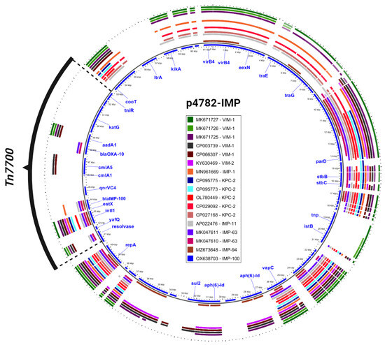 Closest plasmids with carbapenemases. The plasmid accession numbers are listed in the legend and colored differently. The most inner circle (blue) is p4782-IMP which serves as a reference for comparison. Only important gene annotations were visualized in blue text. The novel transposon (Tn7700) is shown in black. The figure was produced with the Gview Atlas server (https://server.gview.ca, accessed on 25 July 2023).