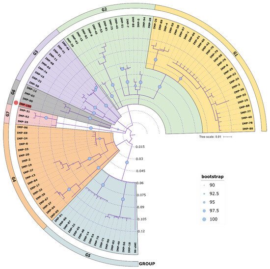 Phylogenetic tree of all available IMP variants. All NCBI available protein sequences were downloaded and aligned with Muscle alignment 3.8.425 in Geneious Prime 2022 and the phylogenetic tree was constructed with Geneious Tree builder with the Jukes–Cantor genetic distance model and the neighbor-joining build method with bootstrap 1000. The tree was visualized in iToL 6.8 (https://itol.embl.de/about.cgi, accessed on 25 July 2023). Cluster groups G1 ÷ G7 were colored differently in accordance to [14], and the new IMP-100 allele is colored in red with a red dot at the tip of the leaf. Bootstrap indices are represented as circles placed at each node ranging in size from 90 (small circle) to 100 (large circle) to show the degree of cluster consistency.