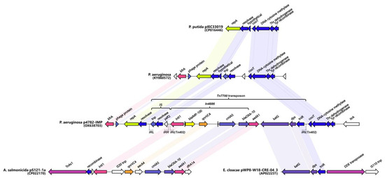 Genetic environment of blaIMP-100. A hypothesized origin of the novel transposon Tn7700 is depicted. Matching genes from the different sources are connected and identically colored. Non-matching genes (either hypothetical proteins or not) are shown in white. Unlabeled genes are hypothetical. The figure was created with Clinker v0.0.28 (https://github.com/gamcil/clinker, accessed on 25 July 2023).