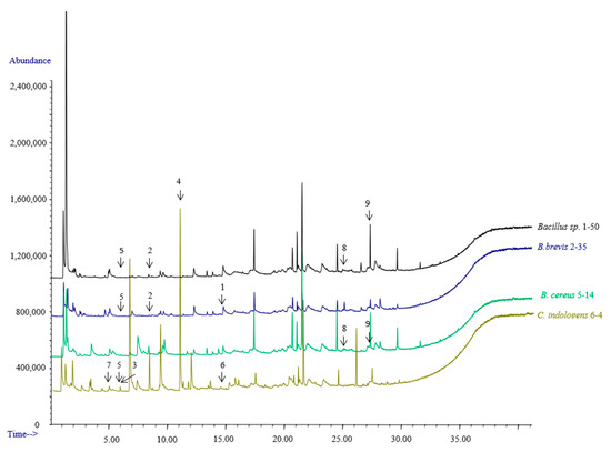 - Huang, Y.; Xu, C.; Ma, L.; Zhang, K.; Duan, C.; Mo, M. Characterisation of volatiles produced from Bacillus megaterium YFM3.25 and their nematicidal activity against Meloidogyne incognita. Eur. J. Plant Pathol. 2009, 126, 417–422. [Google Scholar] [CrossRef]