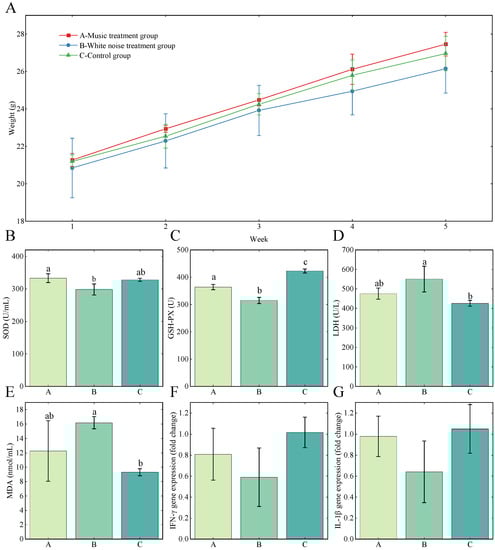Figure 1F,G shows the relative expression level of IFN-γ and IL-1β. Although there are no significant differences between the music treatment group (Ga), white noise treatment group (Gb), and the control group (Gc), the relative expression of IFN-γ and IL-1β were consistently lower in the white noise treatment group and approximately equal between the music treatment group and the control group.