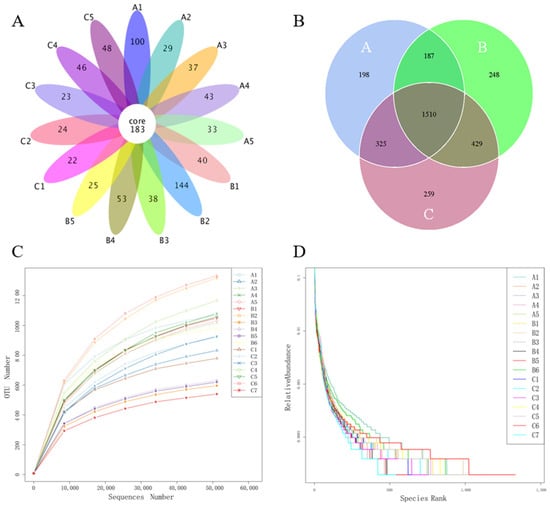 OTUs and sequencing data quality analysis. The flower plot shows the unique and common OTUs between the samples (A). The Venn plot shows the unique and shared OTUs between each group (B). The rarefaction curve (C) and the relative abundance curve (D) reflect the quality of the sequencing data.