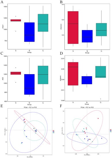 Microbial alpha and beta diversity analysis. (A) Chao1 index; (B) Shannon index; (C) ACE index; (D) Simpson index. The β diversity was reflected by the unweighted (E) and weighted (F) Unifrac PCoA analysis. The vertical columns and different colored spheres and dots represent different groups (A: music treatment group, B: white noise treatment group, C: control group).