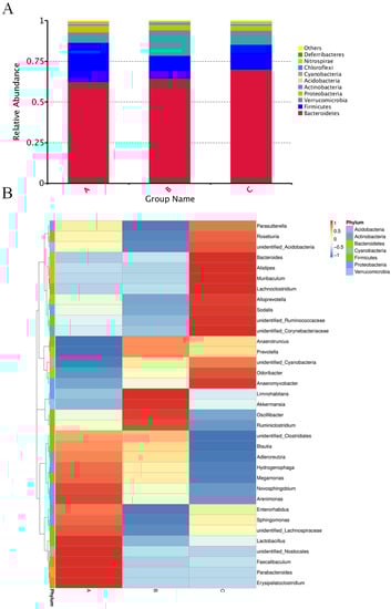 The bacterial composition’s relative abundance in different treatment groups at the phylum level (A) and the heat map of microbial distribution at the genus level. The color key scale shows the Z-score (B). The vertical columns represent different groups: (A) music treatment group, (B) white noise treatment group, (C) control group.