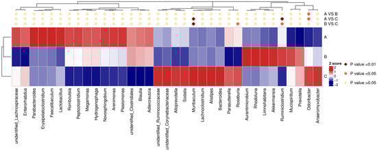Metastats analysis of the samples at the genus level. The horizontal rows represent different groups: (A) music treatment group, (B) white noise treatment group, (C) control group. Vertical columns show the annotation information. The scale of the color key is based on the z-scores.