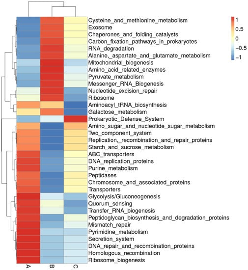 Level 3 functional prediction by Tax4Fun for the gut microbiota. The vertical columns represent different groups: (A) music treatment group, (B) white noise treatment group, (C) control group. Horizontal rows show predicted functions. The scale of the color key is based on the z-scores.