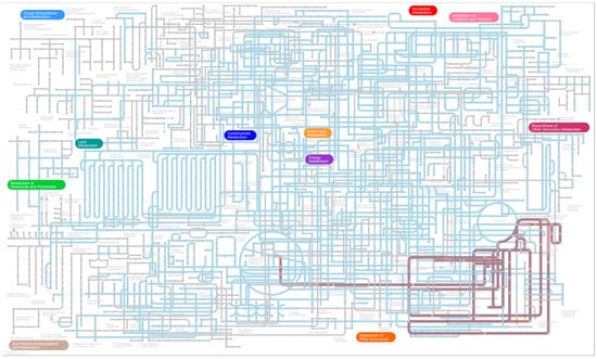 iPath3 illustration of the pathway difference between the intersection (blue) and complement (red) of the music treatment group, white noise treatment group, and control group.