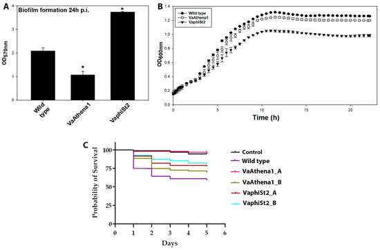 After the generation of bacteriophage-resistant mutants, we proceeded in studying cross-resistance among them, which revealed that phage-resistant strains to φSt2 were also resistant to Athena1 bacteriophage (Table 2). However, the phage-resistant strains to Athena1 did not exhibit resistance to φSt2. Biofilm formation assays demonstrated a low deviation between the independent resistant colonies for each bacteriophage, with the average showing that the resistant strains to Athena1 (VaAthena1) exhibited up to 60% statistically significant reduction in biofilm formation 24 h post-inoculation (Figure 1A). In contrast, the phage-resistant strains VaphiSt2 showed a statistically significant increase of at least 50% in biofilm formation compared to the control group of phage-susceptible bacteria. Interestingly, when studying planktonic cells through growth kinetics, no difference was observed in the case of VaAthena1-resistant strains, but a 20% decrease in growth rate was observed for VaphiSt2-resistant strains (Figure 1B). In regard to the virulence assay, we assessed the average survival probability of fish larvae for two individual colonies of each resistant strain.