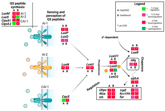 Schematic representation of the QS cascade, including QS perception, biosynthesis, and regulated genes under low cell density. Figure shows fold changes in the relative transcript abundances of genes of bacteriophage-resistant strains VaphiSt2 and VaAthena1, compared to wild-type strains demonstrated as heat maps. Black arrows represent the QS pathway and sigma factors responsible for the transcription of QS-related genes. The dotted arrow represents chaperone activity. In the case of genes CqsA and LuxO, two distinct isoforms were annotated and studied (n = 3; post hoc Student’s test applied for normalized values with p ≤ 0.05; Tukey test applied for non-normalized values).