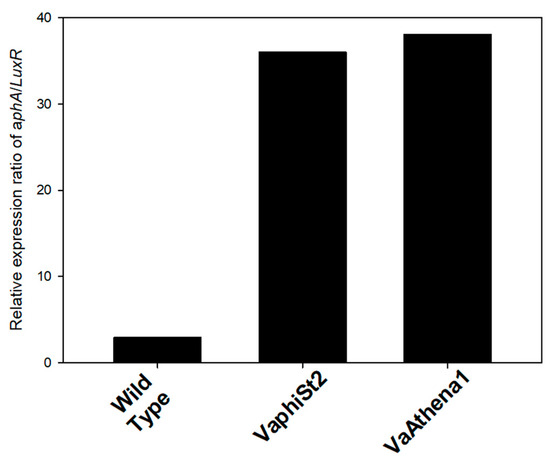 Relative expression ratio of aphA/LuxR of the resistant strains VaphiSt2 and VaAthena1, as well as wild-type susceptible strains.