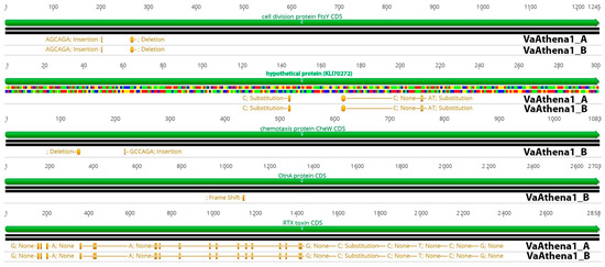 Genome mutations on transcriptional regulators could be responsible for altering the transcriptional status of some genes in phage-resistant mutants; thus, we also examined possible single nucleotide polymorphisms (SNPs) instigated after the development of phage resistance (Tables S3 and S4; Figure 4). For that reason, we sequenced the genome of two phage-resistant colonies resistant to bacteriophage Athena1, which were used in the virulence assay and were found to possess a lower virulence capacity (Figure 1C). By using a threshold of 25% in variance presence, we were able to detect in total, 366 and 279 polymorphisms compared to the wild-type strain. 6,104,378 reads for VaAthena1_A and 7,768,406 reads for VaAthena1_B were utilized with an average read length of 250 bps. This corresponded to at least 300X sequence depth. Common mutations shared between both resistant strains of VaAthena1 were the cell division protein encoded by FtsY gene, SNPs on RTX toxin, and SNPs on a nucleoside permease. More specifically for both VaAthena1 mutants a deletion of six nucleotides at position 264 nt was observed on FtsY responsible for transcribing a cell division protein (KLI70360), a mutation which removed one Glutamate and one Alanine amino acids. In addition to the previously mentioned polymorphisms, we identified a second mutation in the sequenced colonies. This mutation involved the insertion of six nucleotides at position 204, resulting in the addition of one Alanine (Ala) and one Glutamate (Glu) amino acid residue. These mutations are in a tandem repeat motif of the amino acid sequence of FtsY cell division protein. Interestingly in both resistant strains, three mutations were observed to a hypothetical protein (KLI70272), leading to two amino acid substitutions. Specifically, at position 144 nucleotide (nt), Glutamate (Glu) was substituted with Aspartate (Asp), while at position 171 nt, Histidine (His) was replaced with Tyrosine (Tyr). The third mutation was silent and did not result in any protein change. Furthermore, VaAthena1_B exhibited two additional noteworthy mutations in the chemotaxis-secreted protein CheW (KLI71480). Specifically, a deletion at position 131 nt resulted in the removal of one Glutamate (Glu) and one Proline (Pro) amino acid residue. In addition, an insertion at position 219 nt led to the addition of one Proline and one Glutamate amino acid residue. One nt deletion in OtnA gene (KLI70626), related to a polysaccharide secrete protein, resulted in a frameshift at position 1087, which could potentially impair its function Finally, the RTX toxin (KLI69968) and three ribosomal RNAs (5 s, 23 s, and 16 s) were identified as mutual targets of multiple single nucleotide polymorphisms (SNPs) when compared to the wild-type strain. Overall, these results showed that the bacteriophage Athena1 induced a lower number of SNPs in V. alginolyticus-resistant strains compared to bacteriophage φSt2, which harbored almost double SNPs (~500), as recently described [9]. Additionally, resistant mutants to φSt2 introduce SNPs to well-known transcriptional regulators, a phenomenon not observed in resistant mutants to Athena1 lytic phage. Although the cellular receptors are unknown for lytic bacteriophage Athena1, no mutations were detected in previously identified phage adsorption sites of Caudoviricetes order, such as OmpF, BtuB, LamB, and TolC proteins, in both resistant to Athena1 mutants [32].