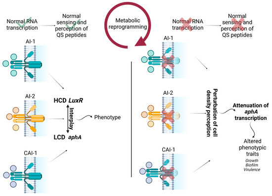 In this study, we clearly observed a transcriptional shift in the QS peptide sensing pathway within a bacterial population experiencing a biotic stress. We found that the transcriptional status of the two-component sensor systems related to autoinducers AI-1 and AI-2 (LuxP, LuxQ, LuxN) was downregulated in both phage-resistant strains. Additionally, in the resistant strains to Athena1, the CA-1 histidine kinase-sensing system (CqsS) also appeared depleted. All these QS two-component systems are located in the inner bacterial membrane and can sense QS peptides presence and abundance in the periplasm [55,56].