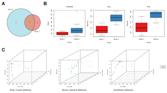 Microbial biodiversity of the renal pelvis urobiome between Stone1 and Stone2. (A) A Venn diagram showing the shared and unique species between two clusters. (B) Comparison of alpha diversity (Chao1, Shannon index, and Simpson index) between two clusters. (C) Comparison of beta diversity between two clusters based on Bray–Curtis distance, binary Jaccard distance, and Euclidean distance. PCoA revealed that Stone1 and Stone2 exhibited different microbial community distributions.
