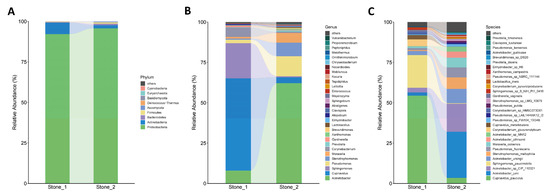 As shown in the Venn diagram, 45 species were shared between Stone1 and Stone2, while 29 species were unique in Stone1 and 178 species were unique in Stone2 (Figure 1A). Alpha diversity was estimated on the Chao1 index (a community richness index) and the Shannon and Simpson index (community diversity indices). The Chao1, Shannon, and Simpson indexes were higher in Stone2 than Stone1 (Figure 1B). For beta diversity, PCoA revealed that microbial composition structure was significantly different between Stone1 and Stone2 based on calculations of the Bray–Curtis distance (ANOSIM, R = 0.9863, p = 0.001), binary Jaccard distance (ANOSIM, R = 0.6737, p = 0.001), and Euclidean distance (ANOSIM, R = 0.9584, p = 0.001) (Figure 1C).