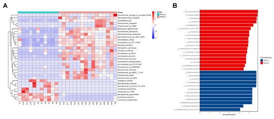 Differential microbial taxa between Stone1 and Stone2. (A) The heatmap shows increased abundance of 8 species and decreased abundance of 32 species in Stone1 compared to Stone2 through an unpaired t-test. (B) LEfSe exhibited 30 discriminative features (LDA score ≥ 4.0) with significant different relative abundances between Stone1 and Stone2.