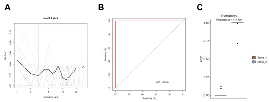 Classification of two clusters by random forest model. (A) The cross-validation error curve showed that three species markers were selected as the optimal marker set. (B) The average AUC value reached 100% between two clusters. (C) The POD value of Stone1 and Stone2.