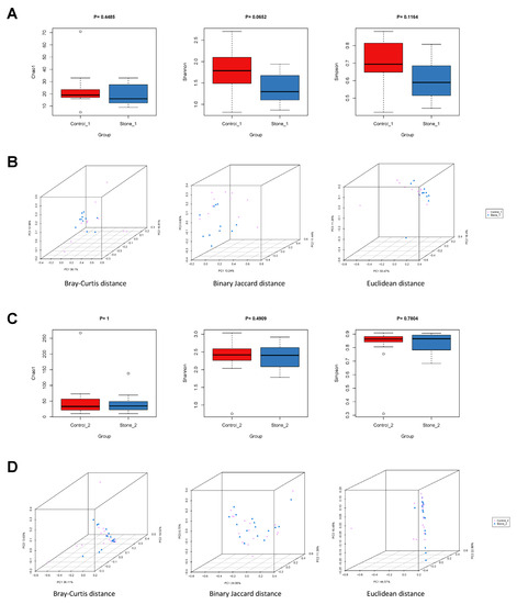 We collected renal pelvis urine from both sides in the same patient, and the samples in the non-stone side compared to Stone1(2) were referred to as Control1(2). Furthermore, we explored whether the urobiome is different between Stone1 and Control1/Stone2 and Control2. For alpha diversity, the Chao1, Shannon, and Simpson indexes were not significantly different between Stone1 and Control1 or Stone2 and Control2 (Figure 5A,C). For beta diversity, PCoA showed significant difference in microbial composition structure between Stone1 and Control1 based on the Bray–Curtis distance (ANOSIM, R = 0.0876, p = 0.032), binary Jaccard distance (ANOSIM, R = 0.1047, p = 0.027), and Euclidean distance (ANOSIM, R = 0.0878, p = 0.043) (Figure 5B). However, no significant difference between Stone2 and Control2 was observed based on Bray–Curtis distance (ANOSIM, R = 0.0061, p = 0.349), binary Jaccard distance (ANOSIM, R = −0.0324, p = 0.837), and Euclidean distance (ANOSIM, R = −0.0075, p = 0.522) (Figure 5D).