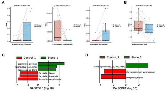 Differential microbial species between Stone1 and Control1/Stone2 and Control2. (A) The boxplot shows that one species was increased and two species were decreased in Stone1 compared to Control1 through a paired t test. (B) The boxplot shows one species was increased in Stone2 compared to Control2 through a paired t test. (C) LEfSe revealed six discriminative species (LDA score ≥ 2.0) with significant different relative abundances between Stone1 and Control1. (D) LEfSe revealed three discriminative species (LDA score ≥ 2.0) with significant different relative abundances between Stone2 and Control2.