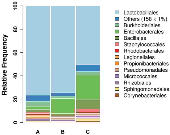 A total of 34 samples were included in the final analysis, due to insufficient DNA amount in one sample. Thus, groups A, B, and C consisted of 12, 11, and 11 samples, respectively. From a minimum of 12,126 to a maximum of 104,841 features per sample were observed, with a total frequency of 2,133,870. In general, 4179 sequences were identified, with an average length of 392.08, a minimum length of 273, and a maximum length of 448. Globally, 171 orders were assigned within the total samples. The most abundant orders were Lactobacillales (68.96%), Enterobacterales (11.64%), Bacillales (3.67%), Burkholderiales (3.10%), and Staphylococcales (1.50%), accounting for 88.87% of the total reads (Figure 1).