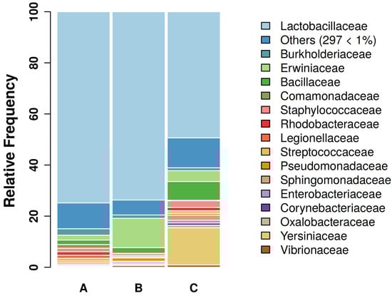 A total of 333 families were identified. The families with the highest relative abundance were Lactobacillaceae, Erwiniaceae, Yersiniaceae, Bacillaceae, Burkholderiaceae, Staphylococcaceae, Rhodobaceraceae, Pseudomonadaceae, Sphingomonadaceae, and Streptococcaceae (Figure 2).