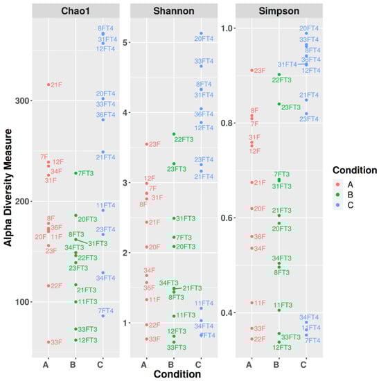 Alpha diversity was assessed by means of Chao1, Shannon, and Simpson’s indexes (Figure 3).