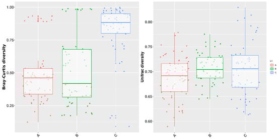Box and whiskers plots illustrating the Beta diversity based on Bray-Curtis and Unweighted Unifrac diversity calculated at the genus level. Groups are represented in different colors, each point being the graphical representation of the distance comparison among the three groups A, B, and C. The lower whiskers represent the values from the minimum value up to the first quartile, and the upper whiskers the values ranging from the third quartile and the maximum value.
