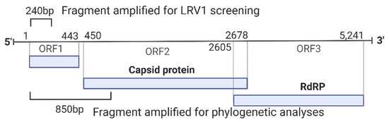 Schematic representation of the genome of LRV1 showing the region amplified for each primer used for screening (240 bp) and phylogenetic analyses (850 bp). RdRP: RNA-dependent RNA polymerase. Genome length based on NCBI RefSeq NC_003601.