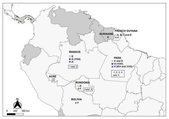 Partial map of South and Central America indicating the countries and Brazilian states where LRV1 has been detected in the Leishmania (Viannia) spp. analyzed in this study. Colored circles refer to species presenting LRV1: pink = L. guyanensis; green = L. braziliensis; purple = L. shawi; blue = L. naiffi. Letters (A to H) indicate groups that are defined according to the phylogenetic analyses (Figure 3); numbers indicate the IOCL for specific strains (Table 1) in such groups; italic numbers inside the rectangles indicate the negative strains analyzed: 1 = L. naiffi; 2 = L. shawi; 3 = L. lainsoni; 4 = L. lindenbergi; 5 = L. utingensis.