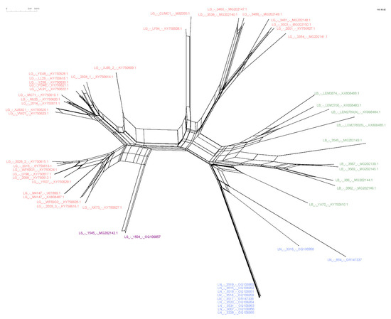 The phylogenetic network shows sequences of clustering similar to those observed with the ML tree. The network, however, suggests a common ancestor relative to the structure for all LRV1s (Figure 4). The structure could be the result of the low amount of recombination between the sequences of the network, representing a bottleneck, or it may be simply a result of divergent phylogenetic signals.