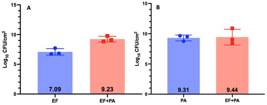 CFUs of EF-BS374 and PA-XEN41 3-day biofilm grown on 316L-SS coupons grown independently and together. Panel (A) shows EF grown as a monospecies and in an EF-BS374 + PA-XEN41 multispecies biofilm. Panel (B) shows PA grown as a monospecies and in an EF-BS374 + PA-XEN41 multispecies biofilm. N = 3, log10 of the geometric mean and 1 SD.