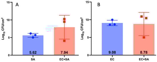 CFUs of SA-SAP231 and EC-BS420 3-day biofilm grown on 316L-SS coupons grown independently and together. Panel (A) shows SA grown as a monospecies and in a SA-SAP231 + EC-BS420 multispecies biofilm. Panel (B) shows EC grown as a monospecies and in a SA-SAP231 + EC-BS420 multispecies biofilm. N = 3, log10 of the geometric mean and 1 SD.