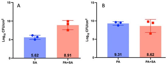 CFUs of PA-XEN41 and SA-SAP231 3-day biofilm grown on 316L-SS coupons grown independently and together. Panel (A) shows PA grown as a monospecies and in a PA-XEN41 + SA-SAP231 multispecies biofilm. Panel (B) shows SA grown as a monospecies and in a PA-XEN41 + SA-SAP231 multispecies biofilm. N = 3, log10 of the geometric mean and 1 SD.