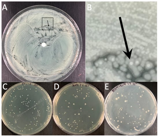 Representative plates of EF-BS374 and PA-XEN41 grown in a multispecies biofilm and a monospecies biofilm with an unloaded bead. PA-XEN41 forms a translucent green lawn whereas EF-BS374 form small circular opaque colonies growing within the lawn of PA-XEN41. The black arrow in Panel (A,B) points towards a single EF-BS374 colony. Panel (A) is the original image and Panel (B) is an enlarged portion of the original photo to better show the EF-BS374 and colony morphology. Panels (C–E) are all plates used to count the number of colonies within the multispecies biofilm and within the monospecies biofilms. Panel (C) is a plate of EF only. Panel (D) is a plate of PA only. Panel (E) is a plate with the multispecies biofilm containing EF + PA where PA colonies were confirmed as separate from EF colonies through bioluminescent imaging.