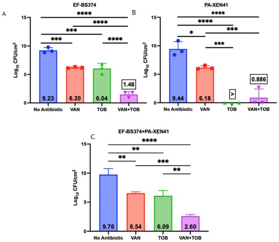 Killing efficacy of dual-species biofilms containing EF-BS374 and PA-XEN41 grown on 316L-SS coupons comparing no antibiotics, VAN alone, TOB alone or use of both VAN + TOB. Panel (A) demonstrates the EF portion of the multispecies biofilm, Panel (B) demonstrates the PA portion of the multispecies biofilm, and Panel (C) demonstrates the total multispecies biofilm. N = 3, log10 of the geometric mean ± SD. (* p < 0.05, ** p < 0.01, *** p < 0.001, **** p < 0.0001).
