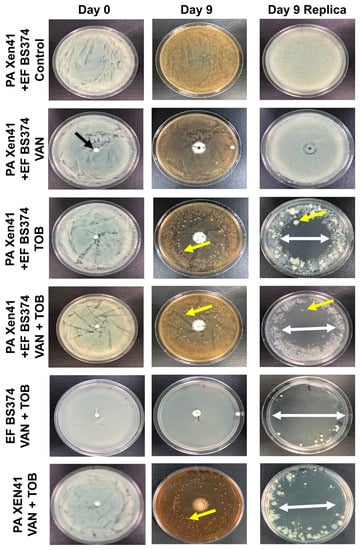 EF-BS374 and PA-XEN41 Light Images. Row 1 represents a control EF-BS374 and PA-XEN41 multispecies biofilm with no bead. Row 2 represents an EF-BS374 and PA-XEN41 multispecies biofilm treated with a HP-ALCSB loaded with 1000 mg VAN alone (black arrow) showing no zone of killing (ZOK) of PA but EF was eradicated. Row 3 represents an EF-BS374 and PA-XEN41 multispecies biofilm treated with a HP-ALCSB loaded with 240 mg TOB alone, showing a ZOK of both species (indicated by white arrow). An antibiotic tolerant variant of PA within the ZOK is indicated by the yellow arrow. The remaining background lawn at the periphery was dominated by EF (smaller colonies). Row 4 represents an EF-BS374 and PA-XEN41 multispecies biofilm treated with a HP-ALCSB loaded with 1000 mg VAN and 240 mg TOB. PA was eradicated but EF (small colonies) were still present in the remaining lawn at the periphery. Row 5 represents a single species EF-BS374 biofilm treated with 1000 mg VAN and 240 mg TOB. Row 6 represents a single species PA-XEN41 biofilm treated with 1000 mg VAN and 240 mg TOB. CSB were added at Day 0 and followed for 9 days before replica plating to observe viability on day 10. Representative antibiotic tolerant colonies growing in the ZOK are indicated by yellow arrows.