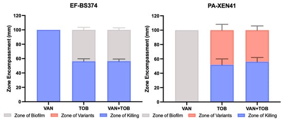 Zones of EF-BS374 and PA-XEN41 multispecies biofilms treated with a VAN, TOB or VAN + TOB HP-ALCSB. Zone of biofilm is the diameter of the unaffected lawn biofilm (grey), the zone of killing is the diameter where there was no growth at all (blue), and the zone of antibiotic tolerant variants was the diameter of the zone between the unaffected biofilm and complete killing (red). N = 3, Mean and 1 SD.