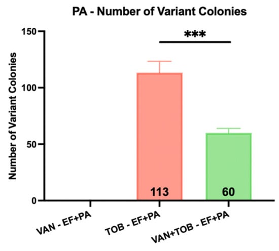 Number of PA antibiotic tolerant variant colonies emerging in the zone of inhibition of the EF + PA multispecies biofilms when treated by VAN, TOB or VAN + TOB. Individual colonies were observed and counted on day 10 of treatment after replica plating for viability. Mean and 1 standard deviation. (*** p < 0.001).