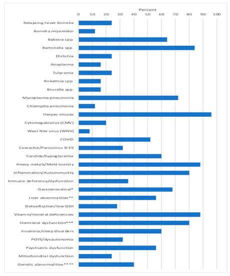 Apart from these infections, other MSIDS variables present which potentially affected underlying symptomology included patients having evidence of 6 different mold toxins (Ochratoxins, 7/25 patients (28%); Trichothecenes, 11/25 (44%); Aflatoxins, 8/25 (32%); Gliotoxins, 11/25 (44%); Zearalenone, 9/25 (36%); Citrinin/Dihydrocitinone, 1/25 (4%); exposure to 8 heavy metals (Mercury (Hg) 10/25 patients (40%); Lead (Pb), 11/25 (44%); Arsenic (As), 3/25 (12%); Tin (Sn), 1/25 (4%); other: Cesium (Ce), Uranium (Ur), Thallium (Thal), Antimony (Sb), 7/25 (28%); Inflammation/Autoimmune markers: 20/25 (80%); Immune Deficiency (CVID), 5/25 (20%); Other immune abnormalities (i.e., CIDP, ↓ CD4 counts, ↓ Total Natural Killer (NK) cells, ↑ IgM antibodies), 5/25 (20%); Leaky Gut/Food Sensitivity/Mast Cell Activation Syndrome (MCAS), 15/25 (60%): GI Microbiome Abnormalities, Gastroparesis, 6/25 (24%); Liver Abnormalities, i.e., Non-alcoholic Steatohepatitis (NASH), ↑ LFT’s, 11/25 (44%); Liver Abnormalities, Low Alkaline Phosphatase, 6/25 (24%); Detoxification Abnormalities, Low glutathione (GSH), 7/25 (28%); Vitamin and mineral deficiencies, 22/25 (88%); Hormonal abnormalities, low adrenal function, 20/25 (80%); Hormonal abnormalities, low testosterone (men), 6/25 (24%); Hormonal abnormalities, absent pituitary function, 1/25 (4%); Hormonal abnormalities, elevated insulin/Polycystic Ovarian Syndrome (PCOS), 1/25 (4%), Hormonal abnormalities, low thyroid function, 7/25 (28%); insomnia/sleep disorders (2 with Obstructive Sleep Apnea, i.e., OSA), 17/25 (68%); POTS/dysautonomia, 8/25 (32%); Psychiatric disorders (Depression, Anxiety, Obsessive Compulsive Disorder (OCD), PTSD, Schizophrenia), 14/25 (56%); Mitochondrial dysfunction, 6/25 (24%); and genetic abnormalities (MTHFR, HLA DR4), 10/25 patients (40%). Figure 1 illustrates the percentage of patients among the 25 participants with overlapping MSIDS variables potentially affecting the clinical outcome.