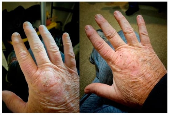 Methylene blue (MB) dosage, apart from the length of HDDCT pulses, affected the efficacy and tolerability of the protocol. Earlier regimens of 4-day HDDCT used 100 mg of MB PO BID (twice a day). These doses were subsequently increased after patients relapsed post-therapy, with evidence of increased methemoglobin. The MB dose was therefore increased to 150–200 mg PO BID, and if symptom relapses persisted with elevations in methemoglobin, the dose was increased to a final dose of 300 mg PO BID while using HDDCT. Examples of increased efficacy of higher doses of MB were seen in patients 10 and 24, who were both Bartonella FISH positive, and patients 14 and 21, who had elevated VEGFs, consistent with active Bartonella. Patient number 10 did her first HDDCT pulse with 100 mg of methylene blue (MB) PO BID, and she was one month symptom-free before relapsing. She therefore did a second 4-day HDDCT pulse, using 200 mg PO BID of MB, which improved symptomatology but was insufficient to put her in full remission. A third HDDCT pulse for 4 days with 300 mg PO BID of MB was therefore instituted, which resulted in her being symptom-free for 2 months, her longest time without a relapse. She recently finished her first 6-day HDDCT pulse using 300 mg PO BID of MB after doing 3/4-day HDDCT pulses with lower doses of MB and has remained 100% symptom-free (approximately 2 more months in remission). Patient number 24 suffered from Lyme disease (C6 ELISA positive), active Babesia (FISH+), active Bartonella (FISH+), and multiple MSIDS abnormalities, including hypopituitarism, POTS, CVID (on IVIG), small fiber neuropathy, severe resistant insomnia, anxiety with PTSD, inflammation, multiple vitamin and mineral deficiencies, and Morgellons’s disease. She had conducted 2 courses of DDDCT, 3 courses of HDDCT for 4 days, and one course of HDDCT for 6 days. Earlier courses of pulse HDDCT were for 4 days and used a lower dose of MB (100–150 mg PO BID). The last 6-day HDDCT pulse used 300 mg of MB. Although there was temporary improvement in symptomatology with DDDCT and three four-day pulses of HDDCT with lower dose MB, it was not until the last course of six days of HDDCT with 300 mg PO BID of MB that she noticed persistent and sustained improvement in energy, myalgias, neuropathy, and cognitive impairment for five months. Patient 21, after 3 courses of DDDCT and 3 courses of HDDDT for 4 days, where the last round used a higher dose of MB at 300 mg BID, resulted in sustained improvements in energy/endurance, headaches, decreased joint pain, decreased neuropathy, dizziness, and some movement of paralyzed muscles of the lower extremities during the past 4 months. The lower doses of MB used in 4-day HDDCT pulses did not result in sustained improvement or movement of paralyzed muscles in the lower extremities. Finally, patient 14 had 3 spp. of Bartonella (Bh, Be, and Bv), an elevated VEGF, implying active Bartonella, and a Bartonella granuloma on her right hand. She also suffered from severe depression and anxiety with POTS, similar to the other patients with multiple species of Bartonella and Babesia. After 2 courses of DDDCT and one 6–7 day course of HDDCT with minocycline, rifampin, azithromycin, and pyrazinamide in December 2022, along with a higher dose of MB at 300 mg PO BID, she noticed a marked improvement in clinical symptomatology, going from 25% to 87% of normal functioning, with improvements in fatigue, chills, joint pains, and cognition. Her joint pain and swelling decreased, and the Bartonella granuloma on her right hand decreased in size by 80%. See Figure 2.