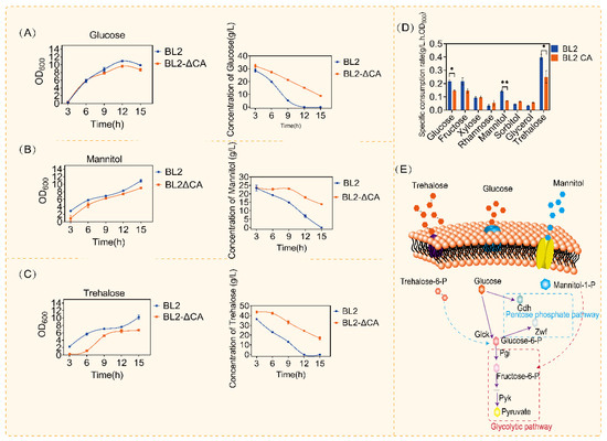 Comparison of consumption of different carbon sources by CcpA defective strains. (A) Glucose consumption and OD600 of Bacillus licheniformis and Bacillus licheniformis CA in medium with glucose. (B) Mannitol consumption and OD600 of Bacillus licheniformis and Bacillus licheniformis CA in medium with mannitol. (C) Trehalose consumption and OD600 of Bacillus licheniformis and Bacillus licheniformis CA in medium with trehalose. (D) Metabolic pathways of glucose, mannitol and trehalose. Statistical comparisons were performed using two-sided Student’s t-test (* p < 0.05, ** p < 0.01). (E) Metabolic pathways of glucose, mannitol and trehalose.