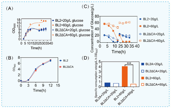 Then, we found an interesting phenomenon by detecting the glucose content in the culture medium. Compared with the original bacteria, glucose consumption was significantly inhibited when ccpA was deleted. Under the condition of 20 g/L glucose culture, the consumption of glucose was not obvious. However, under the condition of 60 g/L glucose culture, the glucose of B. licheniformis CA was about 45 g/L when the glucose consumption of the original bacteria was finished. Similarly, after adding glucose for 24 h, the original bacteria could consume quickly, but the glucose content of B. licheniformis CA did not decrease after adding glucose (Figure 2C). Furthermore, we analyzed the specific consumption rate in the first 12 h. As shown in Figure 2D, when the glucose content was 20 g/L, there was no significant difference in the specific consumption rate, but when the glucose content was 60 g/L, the maximum specific consumption rate of B. licheniformis CA was about 3 times lower than that of the original bacteria. The above results showed that B. licheniformis had a certain inhibitory effect on glucose metabolism after ccpA deletion. Previous reports have shown that CcpA can activate certain genes in the glycolysis pathway [39]. Our results are consistent with previous reports that CcpA plays an important role in the regulation of glucose metabolism.