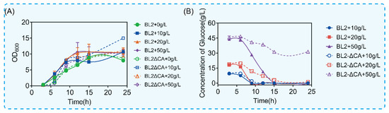 Growth and glucose consumption detection. First, B. licheniformis and B. licheniformis CA were activated on the plate, and then the single colony was cultured in an LB medium for 16 h as seed liquid. Then, the seed liquid was inoculated into TB medium according to a 3% inoculation amount and different concentrations of glucose were supplemented. Then, the inoculated TB medium was cultured at 37 °C 250 rpm. The absorbance at 600 nm was measured at intervals of 3 h. At the same time, the 1 mL sample was centrifuged at 12,000 rpm for 5 min, and the supernatant was precipitated overnight by adding 10% trichloroacetic acid of the same volume. Then, 12,000 rpm was centrifuged for 20 min, and the supernatant was taken into the injection bottle. HPLC (Thermo Fisher Scientific, Waltham, MA, USA) with a refractive index detector and chromatographic column was used to detect the consumption of sugars. The column temperature was maintained at 80 °C and the mobile phase was H2O running at 0.6 mL/min.