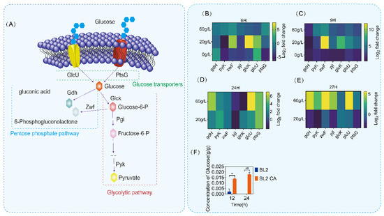Determination of glucose metabolic pathway and transcriptional intensity. (A) Identification of glucose metabolic pathway (glycolysis pathway and pentose phosphate pathway). The pentose phosphate pathway has a blue border, and the pentose phosphate pathway has a red border. (B–E) Determination of transcriptional intensity of glucose metabolic pathway in 6 h, 9 h, 24 h and 27 h. (F) The detection of intracellular glucose content in different time periods showed that blue was primitive bacteria and orange was Bacillus licheniformis CA. Statistical comparisons were performed using two-sided Student’s t-test (* p < 0.05, ** p < 0.01).