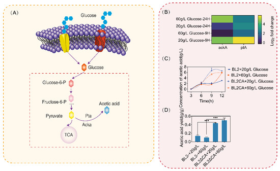 Acetic acid metabolic pathway and acetic acid synthesis. (A) Acetic acid metabolism pathway of Bacillus licheniformis. (B) Determination of transcriptional intensity of acetic acid metabolic pathway. (C) The content of acetic acid in the culture medium was determined. (D) Conversion rate of glucose to acetic acid of Bacillus licheniformis and Bacillus licheniformis CA cultured with different concentrations of glucose at 12 h. Statistical comparisons were performed using two-sided Student’s t-test (*** p < 0.001).