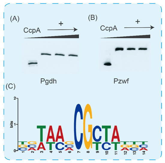 CcpA exerts its regulatory function mainly by binding to specific sites [40,41]. To better understand the molecular mechanism of CcpA regulating glucose metabolic flux, we used EMSA to validate the promoter regions of key genes in the glucose metabolism pathway. As shown in Figure 6A,B, with the increase in CcpA content in the reaction system, we found that the migration of fragments was significantly blocked. Subsequently, we analyzed the promoter sequences gdH and zwF and found that there were cre sites in these two promoters (Figure 6C). From the above experimental results, we found that CcpA of B. licheniformis regulates glucose metabolic flow by controlling the key genes of glycolysis and the pentose phosphate pathway during glucose metabolism, and can inhibit the synthesis of the overflow metabolite acetic acid to maximize energy utilization.