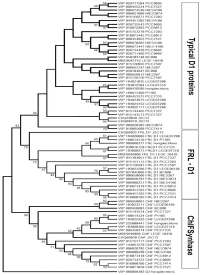 The D1 sequences were retrieved from cyanobacteria containing the FaRLiP gene clusters as described in Wang et al. 2022 [] and then aligned based on the published D1 tree [,]. The subset of D1 homologs (including ChlF sequences) from 18 selected species of cyanobacteria containing the FaRLiP gene cluster were re-aligned with the typical D1 consensus sequence and refined manually according to conserved motifs and predicted secondary structures. The grouped D1 sequences were verified using neighbor-joining (NJ) phylogenetic analysis. The NJ distance tree was determined after 1000 replications using the JTT (Jones, Taylor, and Thornton) model after the deletion of gaps [].